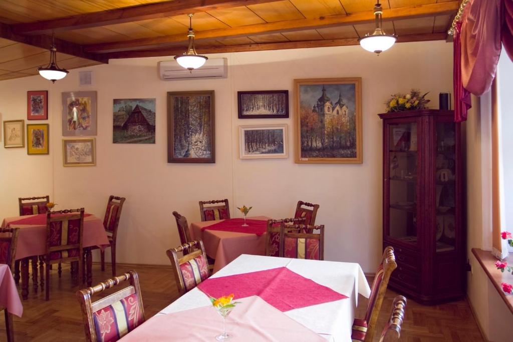 Viesnīcas restorāna gaisotne, uz kuras sienām ir gleznas un dekorācijas, senu pastkaršu reprodukcijas ar Duszniki-Zdrój.